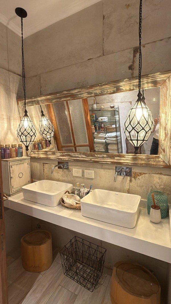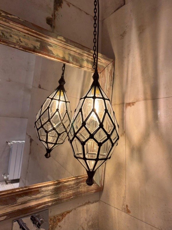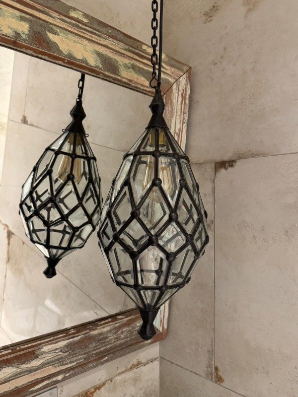 Esta lámpara combina la elegancia del vidrio biselado, trabajado con precisión para reflejar la luz de manera sutil y brillante, con la fortaleza del hierro forjado a mano, ensamblado mediante remaches artesanales que realzan su carácter único y auténtico.
