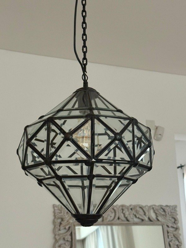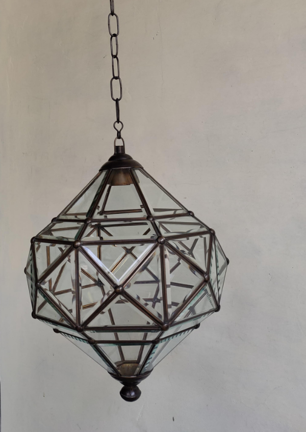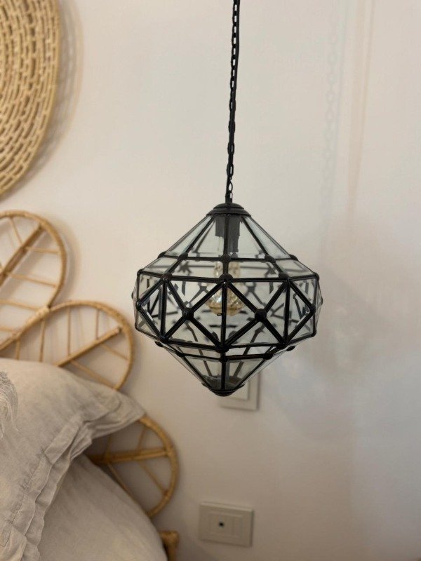 Esta lámpara combina la elegancia del vidrio biselado, trabajado con precisión para reflejar la luz de manera sutil y brillante, con la fortaleza del hierro forjado a mano, ensamblado mediante remaches artesanales que realzan su carácter único y auténtico.