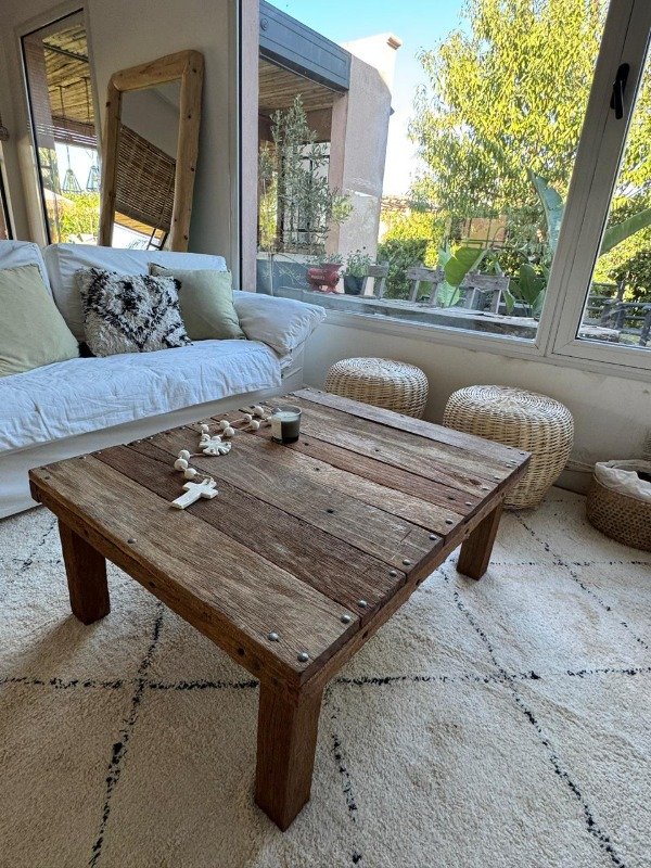 Mesa realizada en madera dura, Lapacho. Madera caracterizada por su dureza y resistencia, siendo una de las mejores para exterior. Es apta para intereperie total, no requiere protección ni tratamiento.